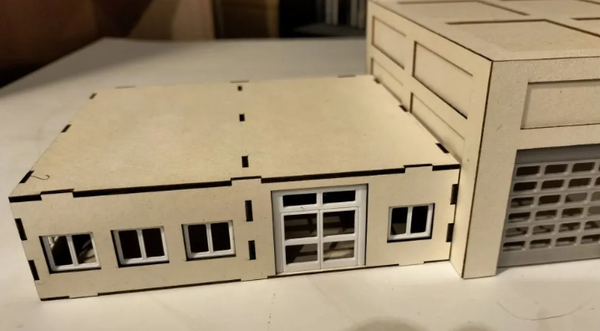 Anbau für die Fahrzeughalle, 12,0cm x 3,5cm x 25,0cm. Der Anbau kann als Feuerwache, Mannschafts- und Geschäftsräume Verwendung finden.Die Bauteile dieses Modells wurden aus grauem Buchbinder-karton lasergeschnitten. Zur Stabilisierung enthält das Modell eine innere Versteifung.