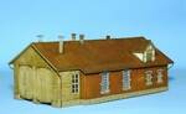 Maßstäblicher Lokschuppen mit beweglichen Toren, Stützbalken und Rauchabzugshauben im Innenteil. Die Unterrsuchungsgruben von Auhagen 41612 (nicht im Bausatz enthalten) können eingebaut werden wenn sie in der Länge entsprechend gekürzt werden.