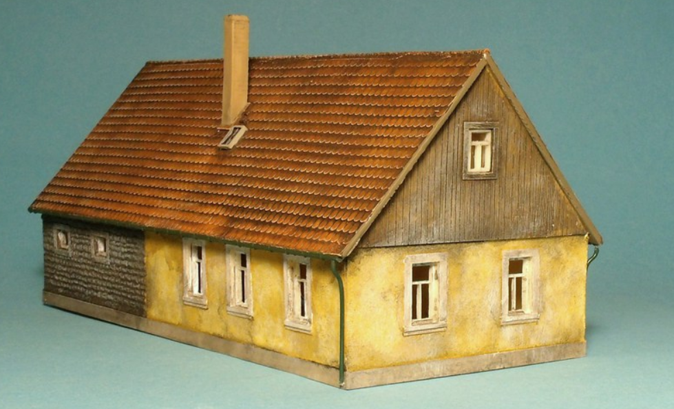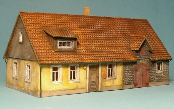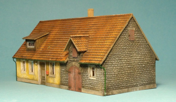 Bauernhaus Hanstedt Niedersachsen an der Bahnstrecke Braunschweig-Hannover (Nebenbahn), Bausatz aus Resingussteilen mit Lasercutteilen.
