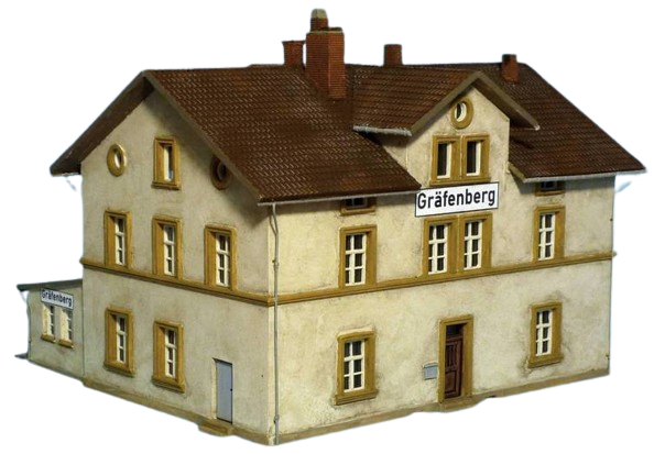 Mehrteiliger Bausatz zum Bau des auf den Fotos abgebildeten Bahnhofmodells im Maßstab 1:87.