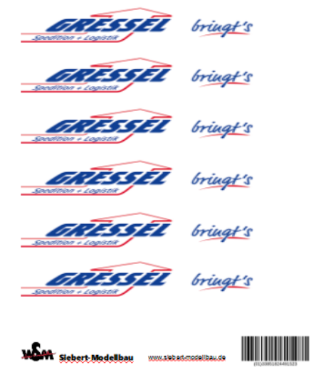 Beschriftungssatz Spedition Gressel, Decal für 3 LKW Modelle mit 20 ft. Container von Herpa und Wiking