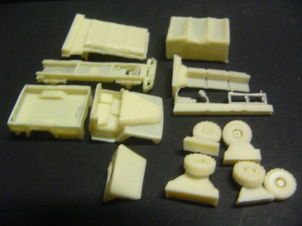 Kompletter Bausatz aus Resingußteilen. Der Bausatz enthält die Kabine mit Inneneinrichtung, Fahrgestell Profile mit Allradreifen und Polystyrolachsen,Pritsche mit Plane, verschiedene Kleinteile wie Kanister und MG sowie einen Beschriftungssatz mit Beschriftungen der französischen Streitkräfte und der UN.