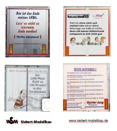 Auf diesem Decal befinden sich vier originelle Sprüche die von den Truckern an Heck ihres Aufliegers oder Anhängers angebracht wurden.